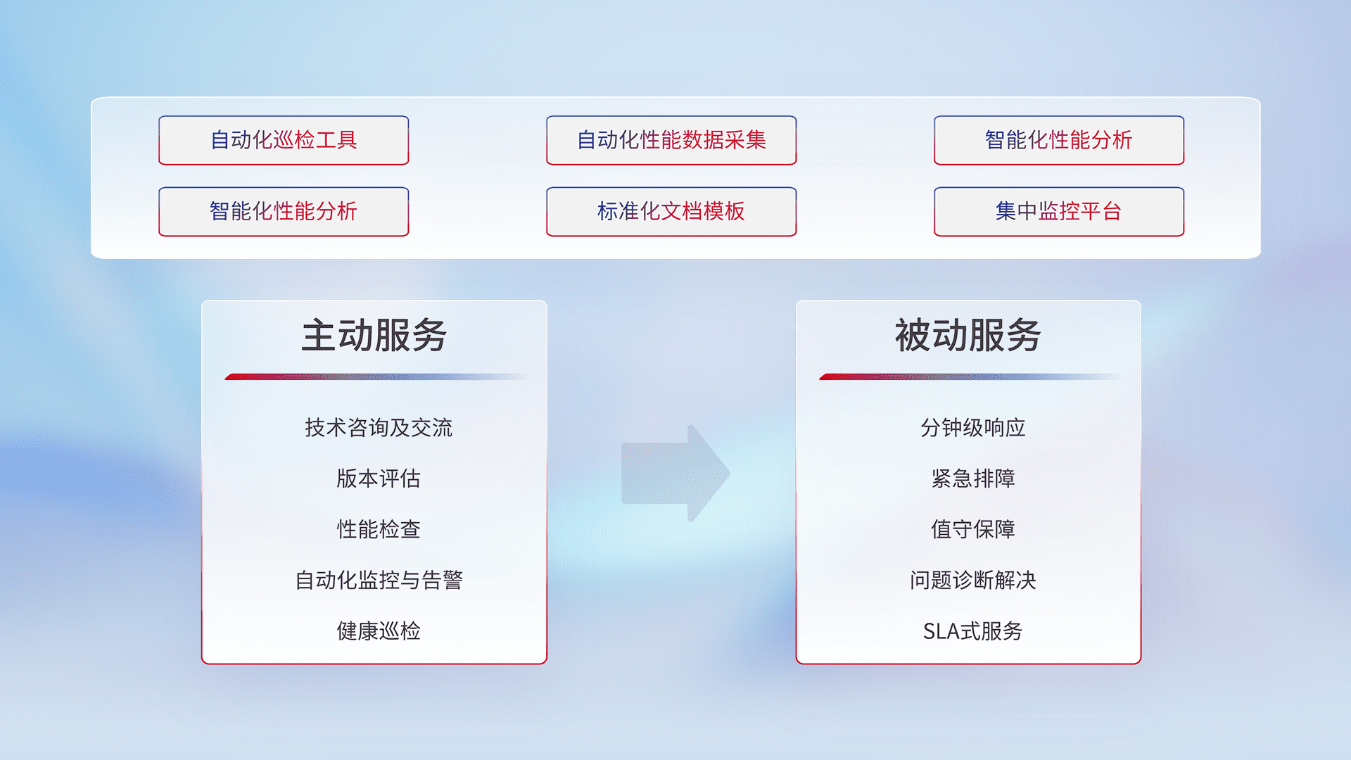 智能化工具和标准化文档,,,,保障服务质量,,,提供主动服务(包含技术咨询、、、版本评估、、、、性能检查、、、自动化监控与告警、、、健康巡检)和被动服务包含(分钟级响应、、、、紧急排障、、值守保障、、问题诊断解决、、、SLA服务)。。。