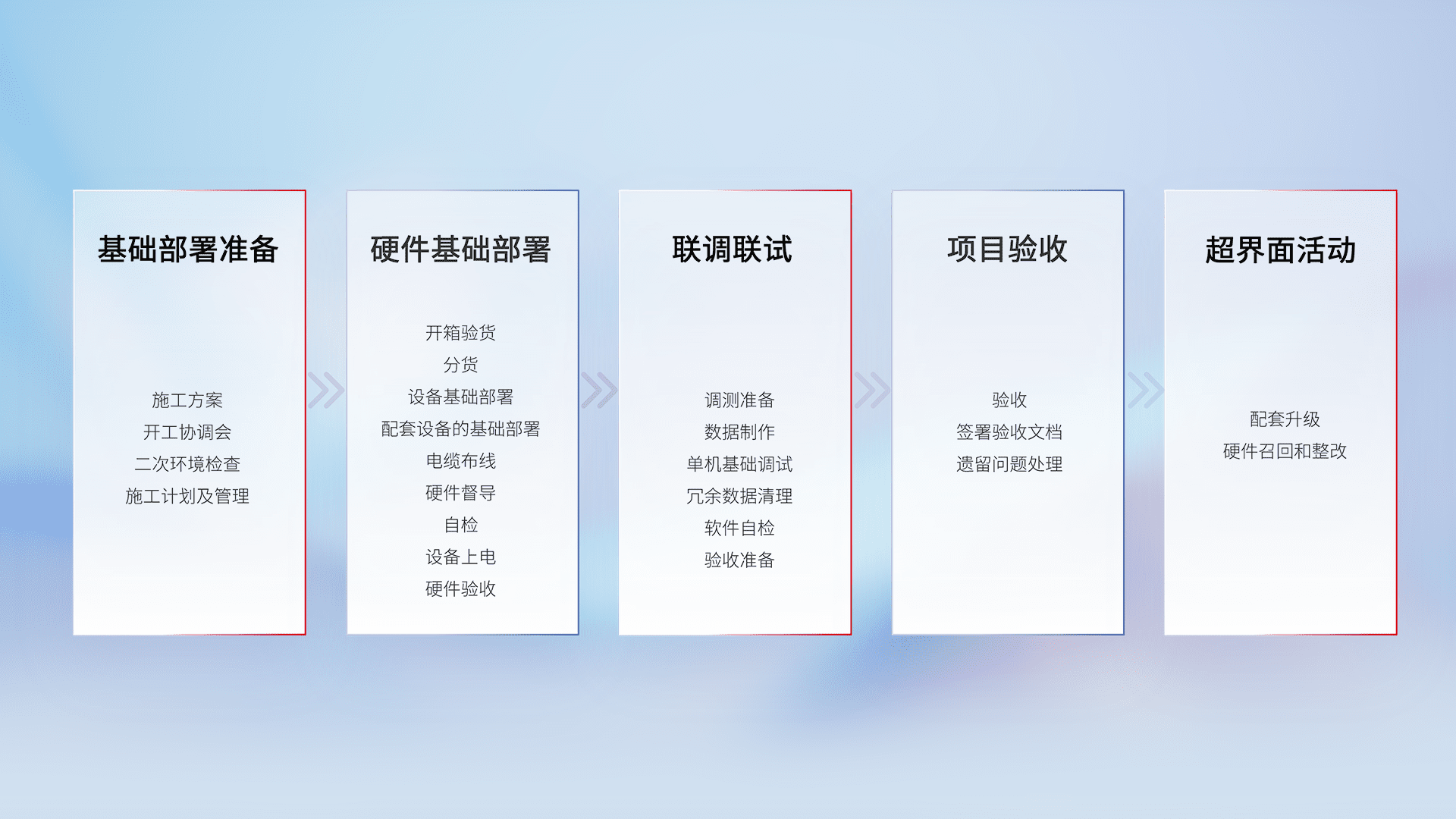 从基础部署准备、、、硬件基础部署、、、联调联试、、、项目验收、、、、越界面活动的全过程可追溯,,,保证施工质量和进度。。。